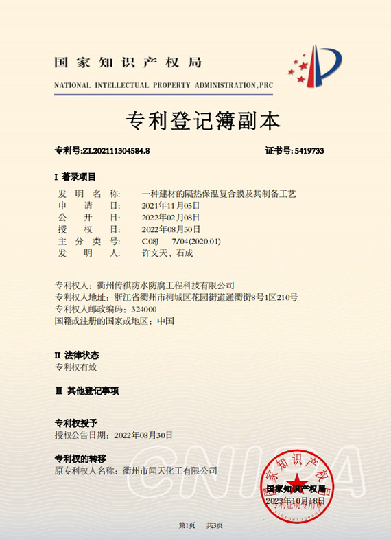 衢州傳祺新材料科技有限公司是衢州市聞天化工有限公司的下屬企業(yè);衢州市聞天化工有限公司成立于2003年,是國內(nèi)最早研發(fā)、生產(chǎn)氟碳涂料的企業(yè)之一。衢州傳祺新材料科技有限公司成立于2017年,公司專注于高分子氟材料的開發(fā)和含氟材料在防腐、防水領(lǐng)域的應(yīng)用。經(jīng)過6年的不懈努力,已獲得了化工和建筑領(lǐng)域六項(xiàng)國家發(fā)明專利授權(quán)和兩項(xiàng)新產(chǎn)品科技成果獎(jiǎng),參與了中國建筑材料流通協(xié)會(huì)《房屋修繕防水工程規(guī)范》標(biāo)準(zhǔn)的編制工作,中建協(xié)涂裝委員會(huì)浙西工作站設(shè)立在我公司。
